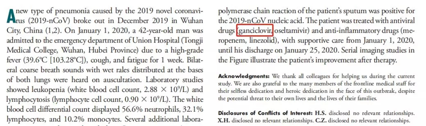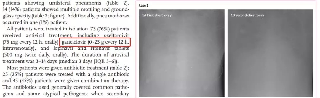 武漢同濟(jì)醫(yī)院專家在《Radiology》上發(fā)表的研究提到,1名42歲的患者在2020年1月1日住院,在此期間接受更昔洛韋、奧司他韋以及其他抗菌藥物治療,最終于2020年1月25日治愈出院。